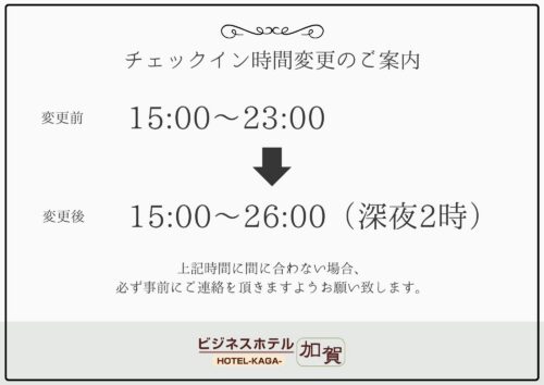- ・チェックイン15:00〜最終26:00(深夜2時)